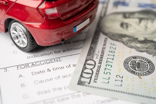 car accident claim with money and toy car, car accident compensation